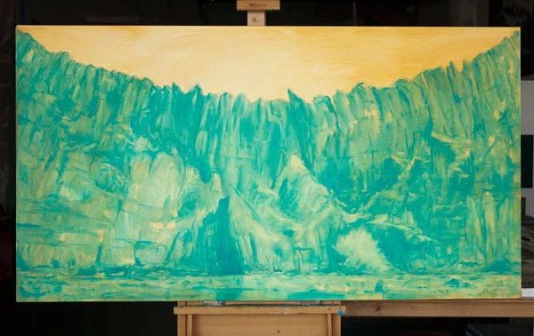 I initially imagined my scene as dark and moody. I envisioned it as having a strange light emanating from within the glacier, revealing shadowy forms of ships and planes trapped in the ice. However the golden yellow color of my under-painting caused me to rethink this direction. I liked how the warm yellow complemented the teal blue of my glacier. It dawned on me that, if I made the sky feel warm and tropical, I could allude to a radically changing climate without the need to include any vehicles in the ice.